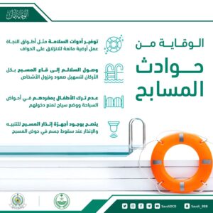 وشددت المديرية أهمية توفير أدوات السلامة، مثل أطواق النجاة، وعمل أرضية مانعة للانزلاق على الحواف، إضافة إلى وصول السلالم إلى قـاع المسبح بكل الأركان؛ لتسهيل صعود ونزول الأشخاص.
