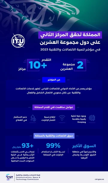 كشف الاتحاد الدولي للاتصالات (ITU) عن حصد المملكة المركز الثاني على دول مجموعة العشرين في مؤشر تنمية الاتصالات والتقنية (IDI) 2023، مسجلة بذلك تقدمها 10 مراكز على دول مجموعة العشرين في المؤشر الذي يرصد اقتصادات 169 دولة لقياس تقدمها في خدمات الاتصالات والتقنية، من خلال عدد من المؤشرات الفرعية المقسمة على محوري الاتصال الشامل والفعال؛ وذلك بهدف قياس تحقيق معايير قوة البنية التحتية، وتوفير اتصال آمن وفعال للجميع.