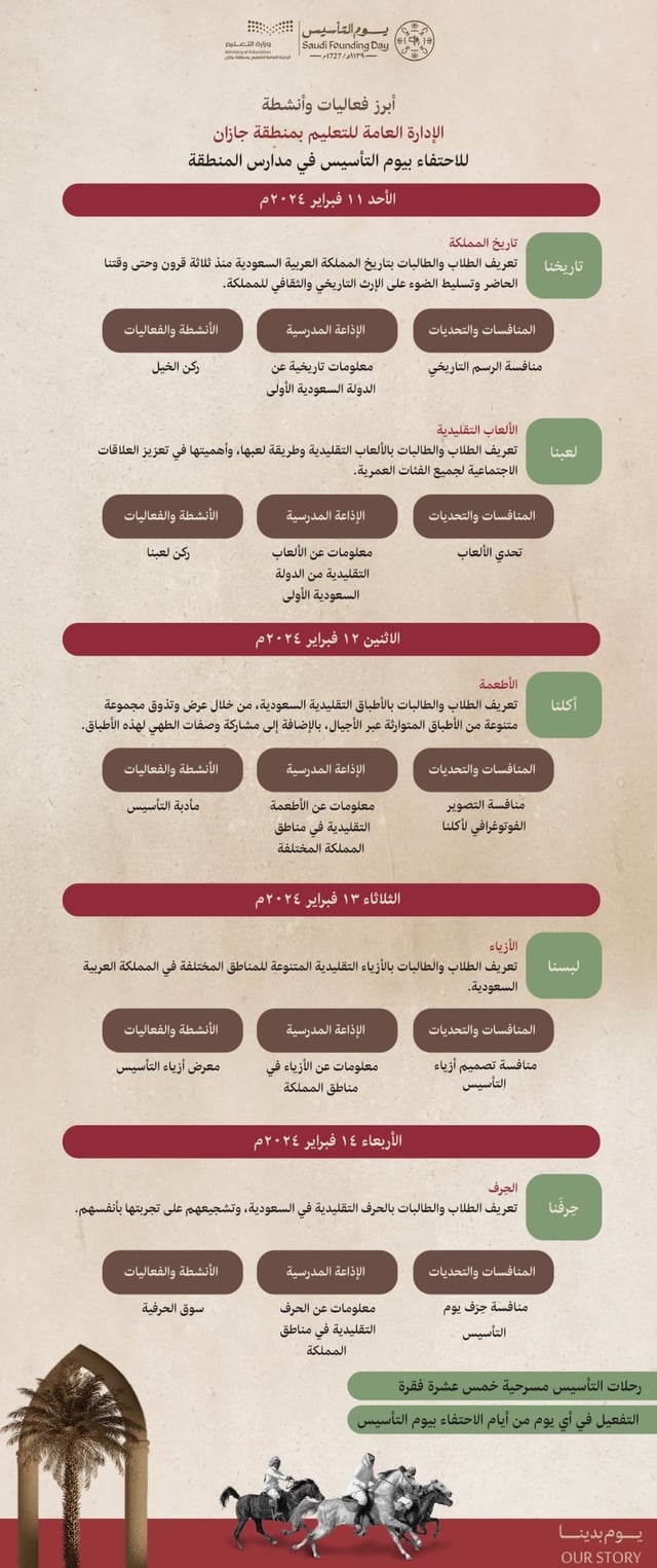 وأضاف “عقدي”: إن مدارس المنطقة من يوم غد الأحد، ستنفذ العديد من الفعاليات؛ أهمها فعالية المنافسات والتحديات، التي تتضمن خمس منافسات تتضمن: رسم الأحداث التاريخية، والتصوير الفوتوغرافي للأطعمة، وتصميم أزياء التأسيس، والحرف التقليدية، وتحدي الألعاب التقليدية، إضافة إلى تنفيذ فعالية الإذاعة المدرسية التي يستعرض من خلالها الطلاب والطالبات كل يوم نمطًا معينًا من التاريخ، والأطعمة، والأزياء التقليدية، والحرف اليدوية، والألعاب التقليدية.
