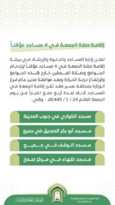 أعلنت إدارة المساجد والدعوة في بيشة، اختيار 4 مساجد، لإقامة صلاة الجمعة فيها مؤقتاً لمدة أربع جمع اعتباراً من يوم الجمعة القادم 24 / 1 / 1445هـ ، وذلك للتخفيف عن الجوامع التي لحظ فيها الزحام وقت الصلاة على مستوى المحافظة .