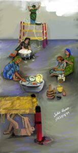 وفي اللوحة نشاهد الفعاليات والتي تسبق الشهر الفضيل من تجهيز الطحين والسمن وشراء جرة لحفظ الماء باردًا وذلك استعدادا لاستقبال لشهر الفضيل وهذه اللوحة التشكيلية تمثل حياة الناس قديما في القرى والبوادي.