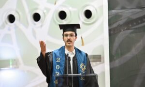 بعدها أُلقيت كلمة الخريجين، عبروا خلالها عن فخرهم واعتزازهم بتخرجهم، ووعدهم أن يكونوا لبنة لبناء وطنٍ غالٍ وعظيم في ظلّ قيادة حكيمة.