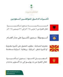 وعن مقدونيا الشمالية والجبل الأسود، قالت السفارة: مقدونيا الشمالية مطلوب فيها الحصول على تأشيرة مقدونية أو تأشيرة شنغن أو أمريكية أو بريطانية أو أسترالية مستخدمة؛ في حين أن الجبل الأسود بدون تأشيرة خلال الفترة من 13 يونيو إلى 31 أكتوبر 2024م.