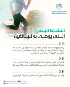 أوصى المجلس الصحي السعودي، بثلاثة أنواع من النشاط البدني الذي يُوصَى به للبالغين.
