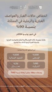 شهدت المملكة انخفاضًا ملحوظًا في حالات الغبار والعواصف الغبارية والرملية خلال شهر يونيو للعام الجاري 2024م بنسبة بلغت 90%، لأول مرة منذ 20 عامًا، مقارنةً بمتوسط الحالات للفترة الزمنية للـ 20 سنة الماضية.