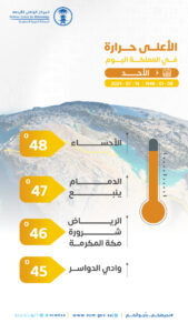 وأفاد المركز في “إنفوجرافيك”، عبر منصة “إكس” بأن الأعلى حرارة في المملكة اليوم، في مناطق: الأحساء بـ 48 درجة مئوية، والدمام وينبع بـ47 مئوية، والرياض وشرورة ومكة المكرمة بـ 46 مئوية، ووادي الدواسر بـ 45 مئوية.