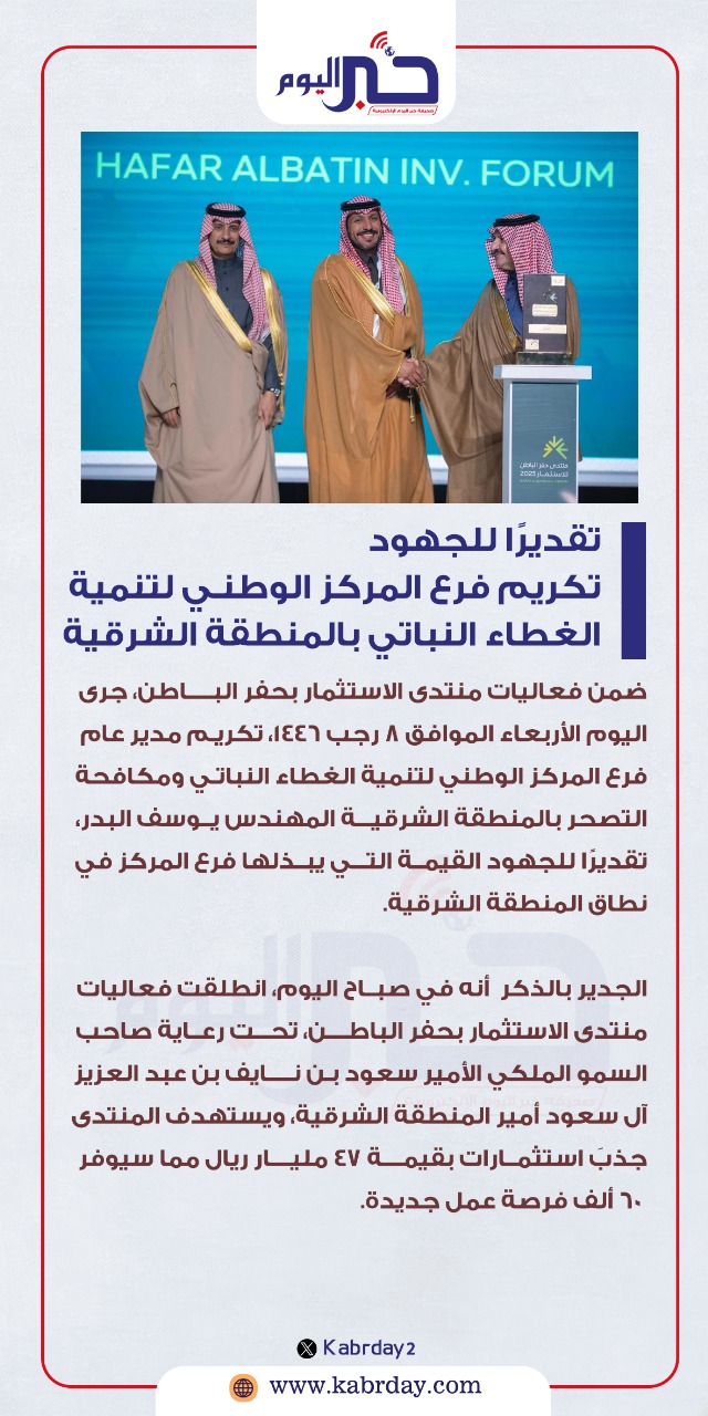 ضمن فعاليات منتدى الاستثمار بحفر الباطن، جرى اليوم الأربعاء الموافق 8 رجب 1446، تكريم مدير عام فرع المركز الوطني لتنمية الغطاء النباتي ومكافحة التصحر بالمنطقة الشرقية المهندس يوسف البدر، تقديرًا للجهود القيمة التي يبذلها فرع المركز في نطاق المنطقة الشرقية.
