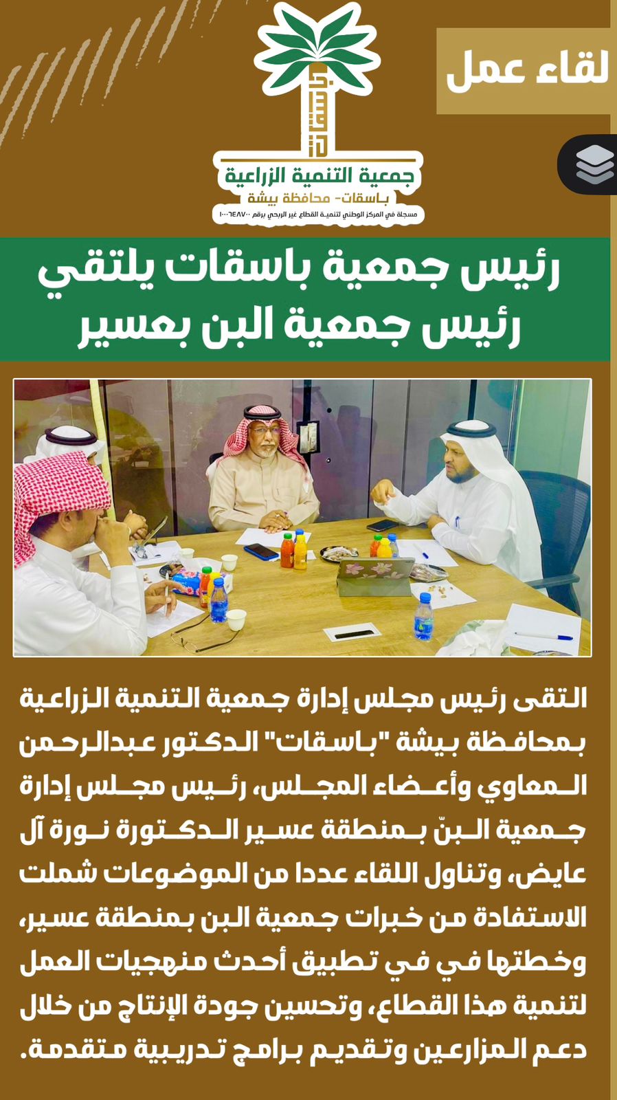 التقى رئيس مجلس إدارة جمعية التنمية الزراعية بمحافظة بيشة “باسقات” الدكتور عبد الرحمن المعاوي وأعضاء المجلس برئيس مجلس إدارة جمعية البنّ بمنطقة عسير الدكتورة نورة عبد الرحمن آل عايض، وتناول اللقاء عددًا من الموضوعات شملت الاستفادة من خبرات جمعية البن بمنطقة عسير، وخطتها في تطبيق أحدث منهجيات العمل لتنمية هذا القطاع، وتحسين جودة الإنتاج من خلال دعم المزارعين وتقديم برامج تدريبية متقدمة.