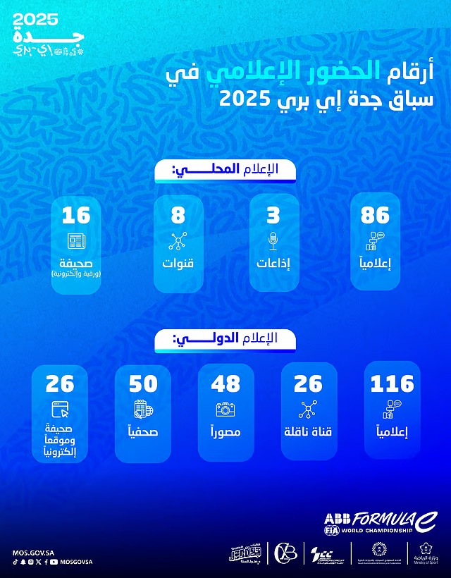وشهد 86 إعلاميًا محليًا سباق “جدة إي بري 2025″؛ سعيًا لنقل آخر الأخبار، وأبرز المستجدات، إلى جانب وجود 8 قنوات، و3 إذاعات، و16 صحيفة ورقية وإلكترونية، لوضع المشاهد في قلبِ الحدث، فيما شهد السباق حضورًا دوليًا كبيرًا، تمثّل بوجود 26 قناة ناقلة، وتغطية من 116 إعلاميًا، بوجود 50 صحفيًا، و48 مصورًا، و26 صحيفة وموقعًا إلكترونيًا.