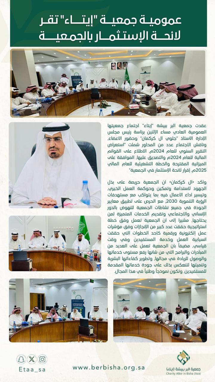 عقدت جمعية البر ببيشة “إيتاء” اجتماع جمعيتها العمومية العادي مساء الاثنين برئاسة رئيس مجلس الإدارة الأستاذ “جلوي آل كركمان” وحضور الأعضاء، وناقش الاجتماع عددًا من المحاور شملت “استعراض التقرير السنوي للعام 2024م، الاطلاع على القوائم المالية للعام 2024م والتصديق عليها، الموافقة على الميزانية المقترحة والخطة التشغيلية للعام المالي 2025م، إقرار لائحة الاستثمار في الجمعية”.