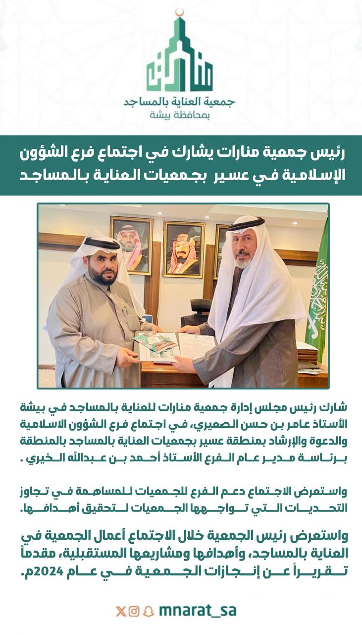 شارك رئيس مجلس إدارة جمعية منارات للعناية بالمساجد في بيشة الأستاذ عامر بن حسن الصعيري، في اجتماع فرع الشؤون الإسلامية والدعوة والإرشاد بمنطقة عسير بجمعيات العناية بالمساجد بالمنطقة برئاسة مدير عام الفرع الأستاذ أحمد بن عبد الله الخيري، واستعرض الاجتماع دعم الفرع للجمعيات للمساهمة في تجاوز التحديات التي تواجهها الجمعيات لتحقيق أهدافها.