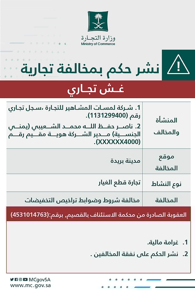 وأعلنت الوزارة الحكم الصادر من محكمة الاستئناف بمنطقة القصيم المتضمن فرض غرامة مالية، ونشر الحكم على نفقة المخالفين.