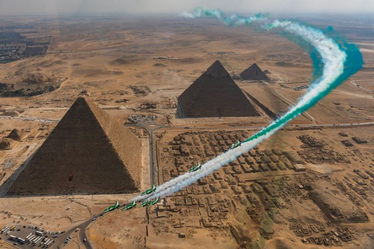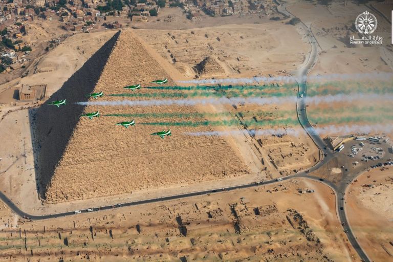 ووصلت في وقت سابق طائرات فريق الصقور السعودية من نوع “هوك” بكامل طواقمها الجوية والفنية، إلى جمهورية مصر العربية، للمشاركة في حفل الافتتاح.