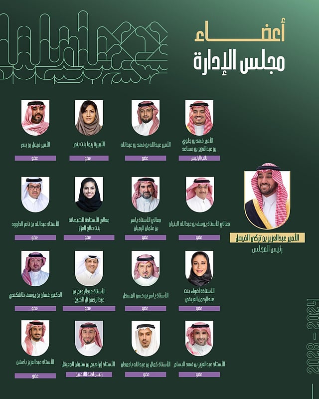 وضمَّ مجلس الإدارة الجديد: الأمير فهد بن جلوي بن عبدالعزيز بن مساعد نائباً للرئيس، وعضوية كل من: الأمير عبدالله بن فهد بن عبدالله، والأميرة ريما بنت بندر بن سلطان بن عبدالعزيز، والأمير فيصل بن بندر بن سلطان بن عبدالعزيز، ووزير التعليم يوسف بن عبدالله البنيان، ومحافظ صندوق الاستثمارات العامة ياسر بن عثمان الرميان، والشيهانة بنت صالح العزاز، وعبدالله بن ناصر الداوود، وأضواء بنت عبدالرحمن العريفي، وياسر بن حسن المسحل، وعبدالرحيم بن عبدالرحمن آل الشيخ، والدكتور غسان بن يوسف طاشكندي، وعبدالعزيز بن فهد البسام، وكمال بن عبدالله باحمدان، وإبراهيم بن سلمان المعيقل.