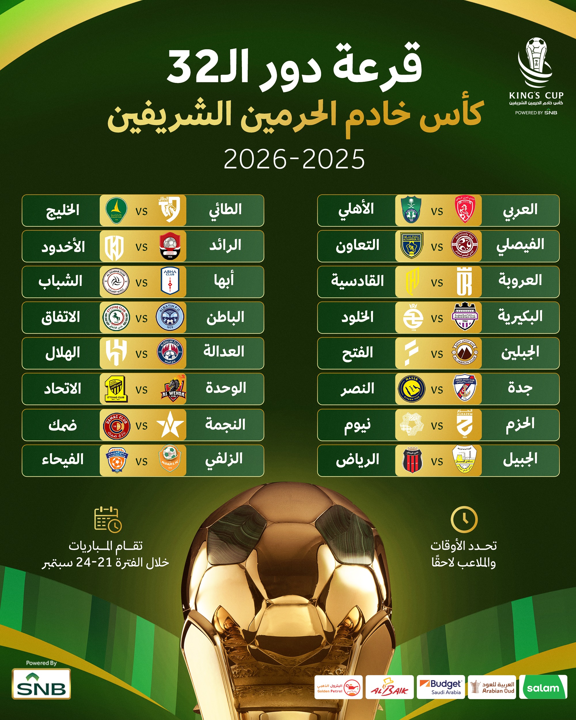 أجريت عصر اليوم الاثنين مراسم قرعة دور الـ32 من بطولة كأس خادم الحرمين الشريفين لكرة القدم لموسم 2025-2026، وذلك بحضور ممثلي الأندية المشاركة، حيث تم توزيع الفرق على مستويين وفقًا لتصنيف الأندية في دوري روشن السعودي.