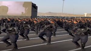 وردد أفراد وضباط قوات أمن الحج الأهازيج، خلال الاستعراض استعدادا للمشاركة في مهمة حج هذا العام بقولهم: “من جبل مكة العظيم.. مولد الهادي الأمين”.