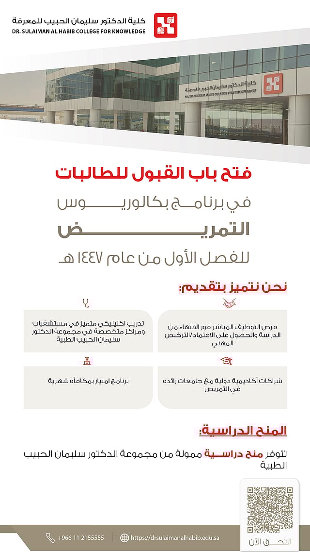 كشفت كلية الدكتور سليمان الحبيب للمعرفة عن فتح باب القبول والتسجيل بالكلية، لبرنامج بكالوريوس العلوم في التمريض للطالبات، وذلك عبر موقعها الإلكتروني ابتداءً من اليوم ويستمر استقبال الطلبات حتى التاسع من أغسطس للعام 2025م.