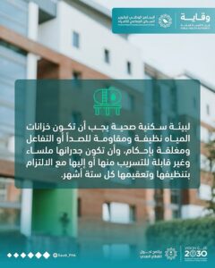 ضمن جهودها لتعزيز السلامة الصحية في المساكن الجماعية، أكدت هيئة الصحة العامة “وقاية” أهمية صيانة خزانات المياه بشكل دوري، مشيرة إلى ضرورة تنظيفها وتعقيمها مرة كل ستة أشهر على الأقل لضمان بيئة سكنية صحية وخالية من الملوثات.