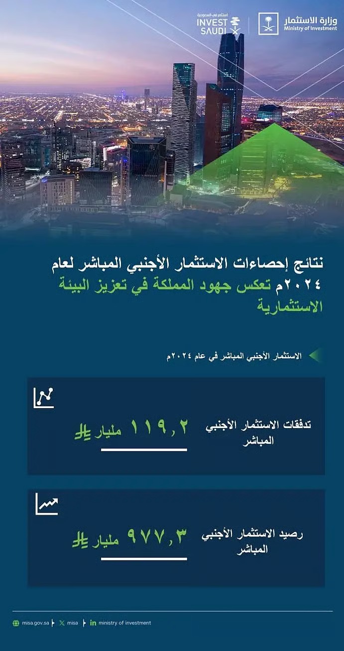 يُذكر أن تدفقات الاستثمار الأجنبي المباشر تضاعفت أكثر من 4 مرات مقارنة بعام 2017م، وارتفع رصيدها التراكمي إلى 977.3 مليار ريال في 2024م، مقابل 501.8 مليار ريال في 2017م، فيما تضاعفت الرخص الاستثمارية الصادرة بأكثر من 10 أضعاف منذ عام 2016م.