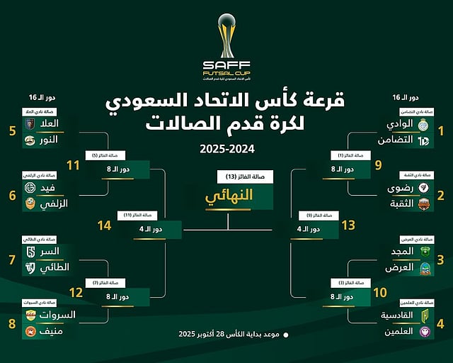 وفي المقابل، أسفرت قرعة دور الـ16 من كأس الاتحاد لكرة قدم الصالات عن مواجهات: الوادي × التضامن، رضوى × الثقبة، المجد × العرض، القادسية × العلمين، العلا × النور، فيد × الزلفي، السر × الطائي، السروات × منيف، على أن تبدأ منافسات البطولة يوم الثلاثاء 28 أكتوبر القادم.