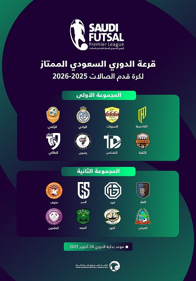 تمت لجنة المسابقات في الاتحاد السعودي لكرة القدم، اليوم (الثلاثاء)، قرعتي الدوري الممتاز لكرة قدم الصالات لموسم 2025 – 2026 وكأس الاتحاد السعودي لكرة قدم الصالات لموسم 2024 – 2025، وذلك عبر تقنية الاتصال المرئي وبحضور ممثلي الأندية المشاركة.