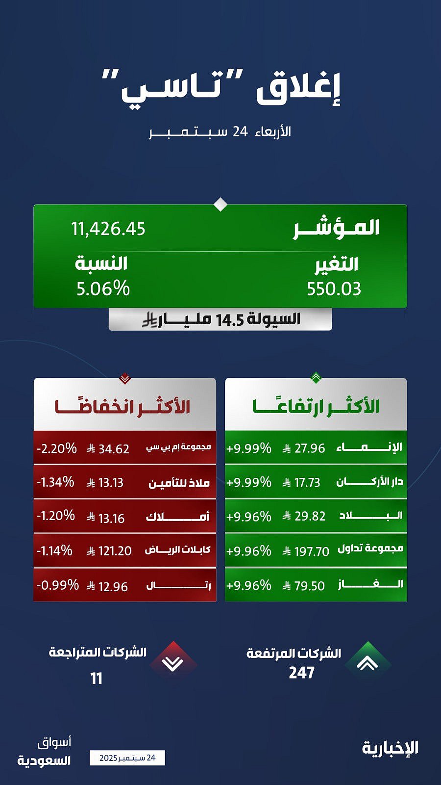 اختتمت سوق الأسهم السعودية تداولات اليوم الأربعاء على صعود قوي، حيث أغلق المؤشر العام “تاسي” مرتفعًا بنسبة 5.06% ليكسب 550 نقطة ويستقر عند مستوى 11,426 نقطة، مسجلًا بذلك أفضل أداء يومي له منذ بداية العام 2025.