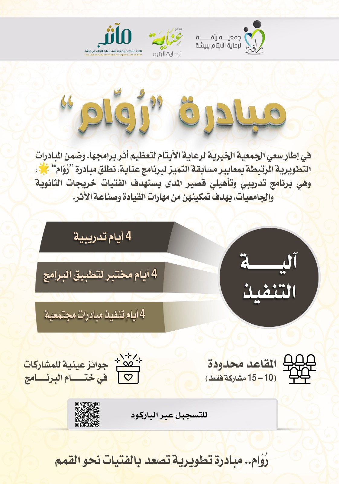 أطلقت الجمعية الخيرية لرعاية الأيتام مبادرة “رُوّام” ضمن إطار برنامج عناية ومعايير مسابقة التميز، كخطوة تطويرية تهدف إلى تمكين الفتيات خريجات الثانوية والجامعيات من مهارات القيادة وصناعة الأثر المجتمعي.