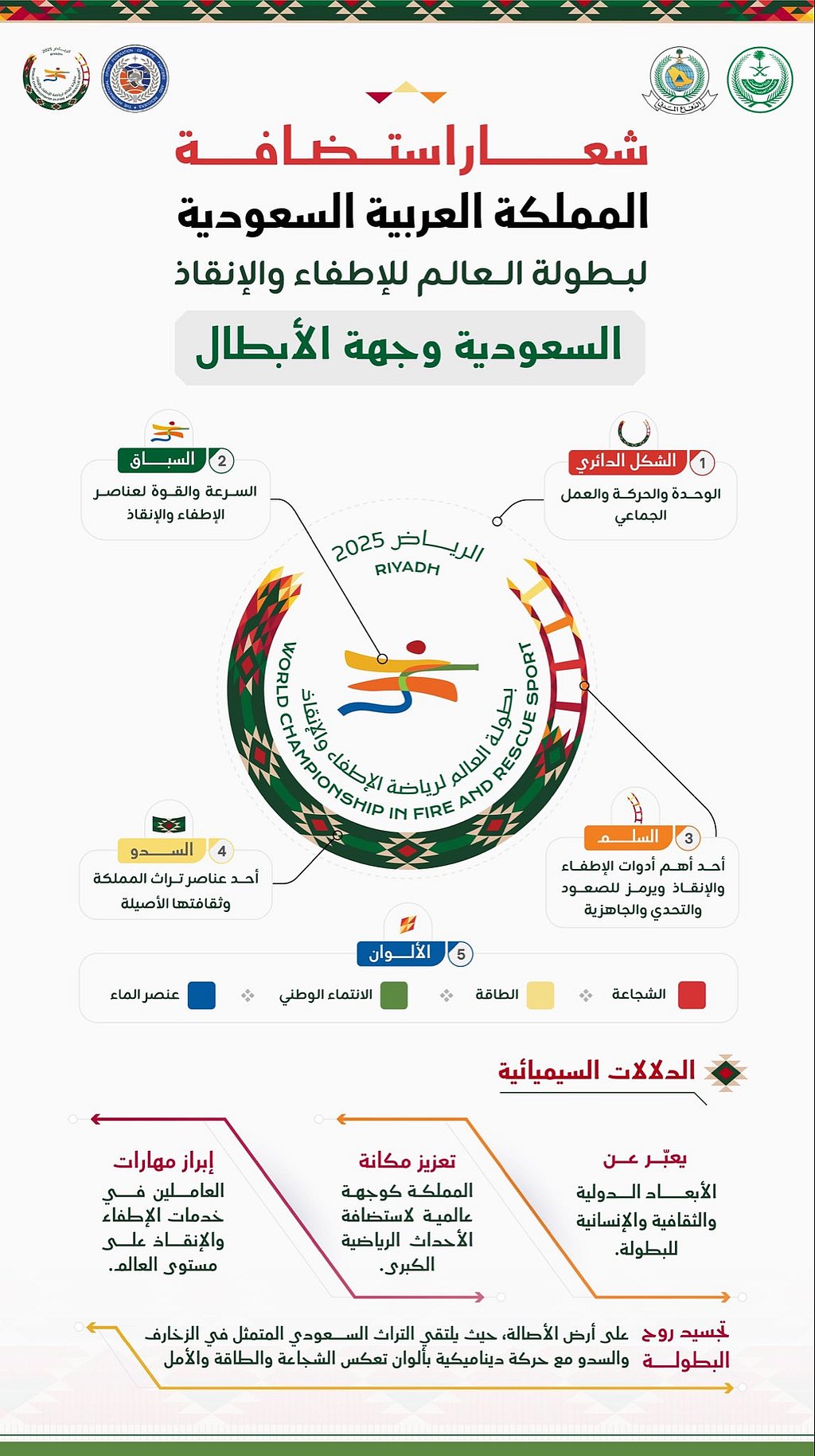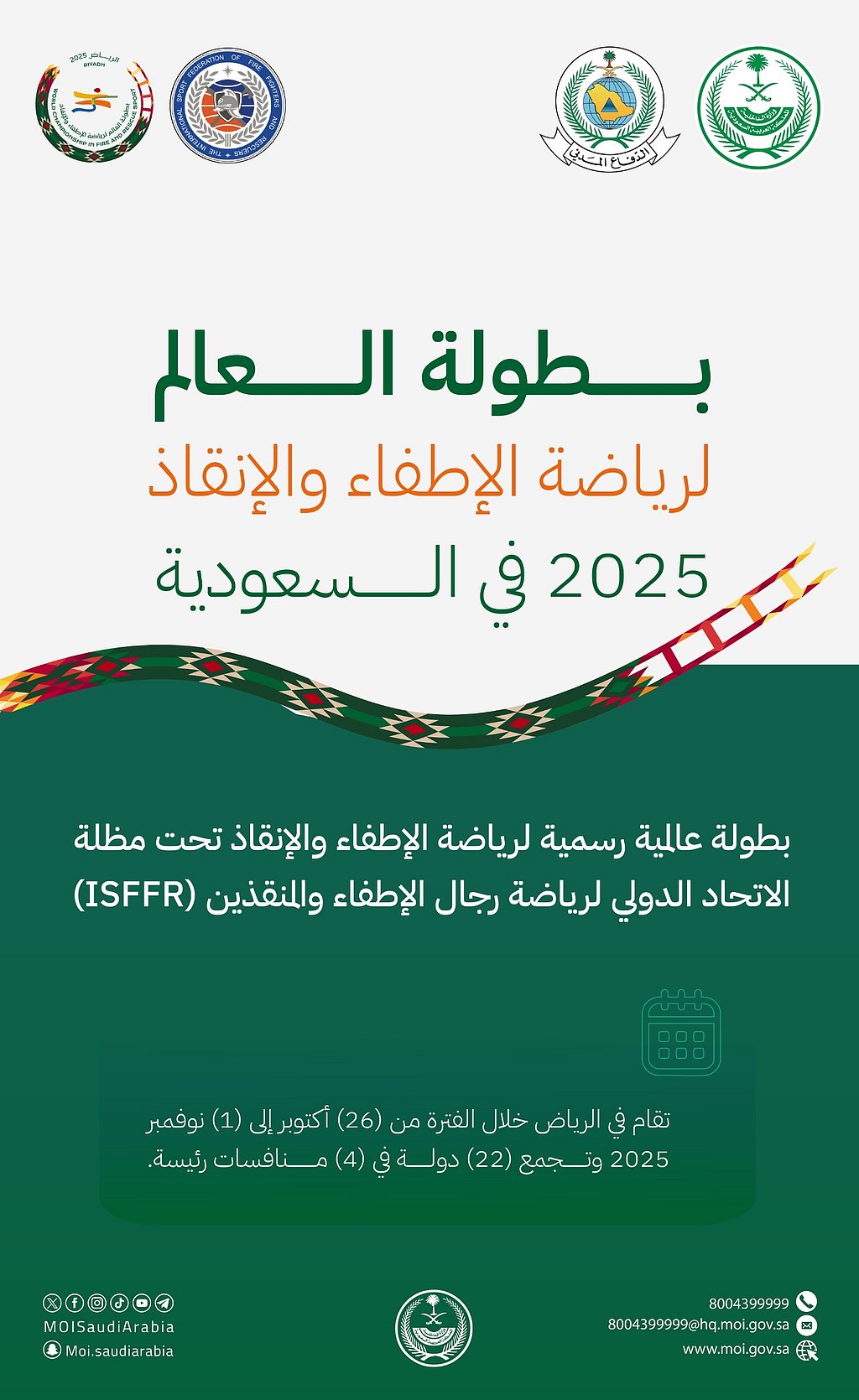 يرعى الأمير عبدالعزيز بن سعود بن نايف بن عبدالعزيز وزير الداخلية، يوم 28 أكتوبر الجاري، حفل افتتاح بطولة العالم لرياضة الإطفاء والإنقاذ، التي تستضيفها المملكة خلال المدة من 26 أكتوبر إلى 1 نوفمبر 2025م في الرياض، وتنظمها المديرية العامة للدفاع المدني بالشراكة مع الاتحاد الدولي لرياضة الإطفاء والإنقاذ.