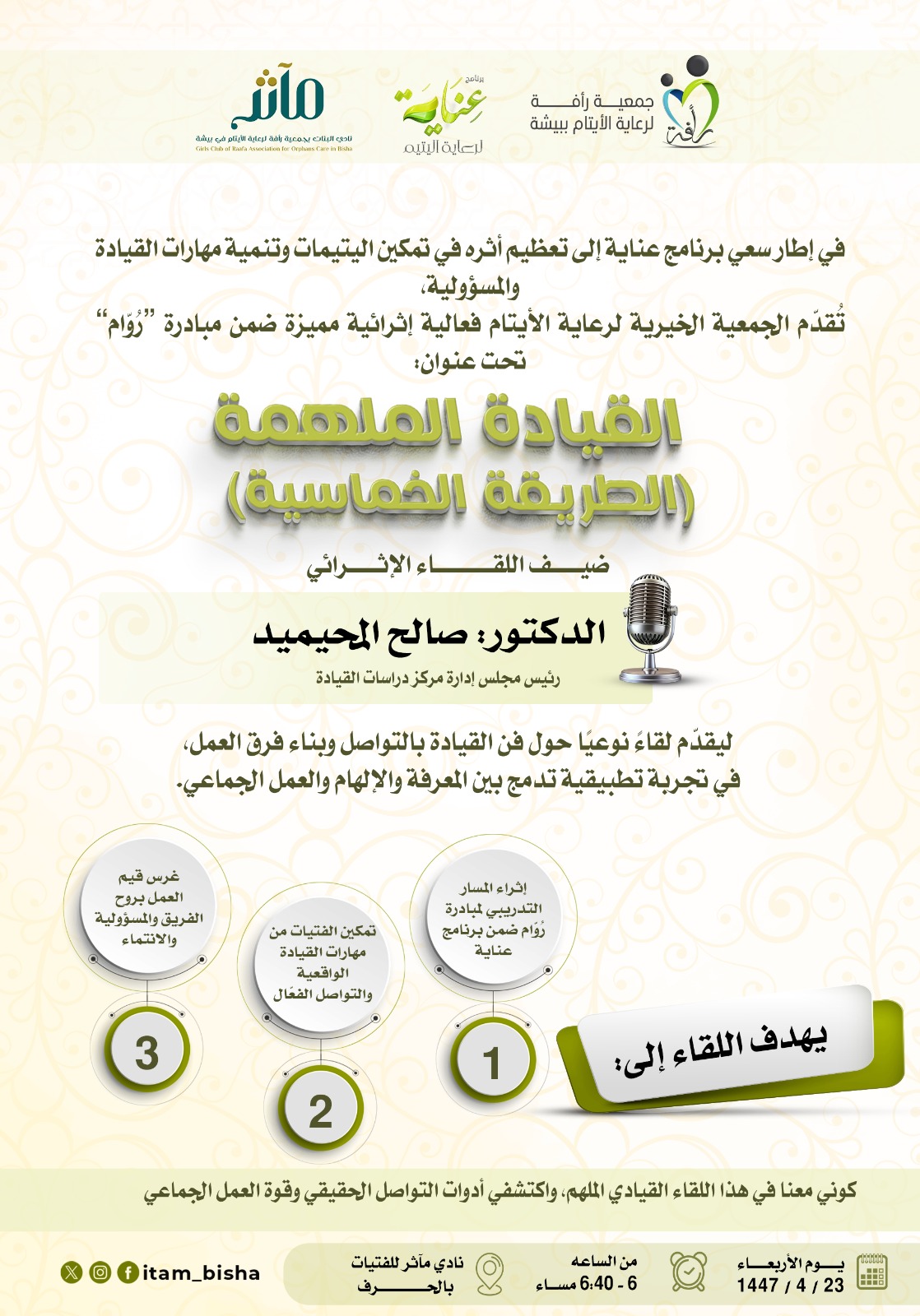 في إطار سعي برنامج عناية إلى تعظيم أثره في تمكين اليتيمات وتنمية مهارات القيادة والمسؤولية، نظّمت جمعية رأفة لرعاية الأيتام بمحافظة بيشة اليوم الأربعاء 23 ربيع الآخر فعالية إثرائية مميزة ضمن مبادرة «رُوام» تحت عنوان «القيادة الملهمة: الطريقة الخماسية» في نادي مآثر للفتيات بالحرف.