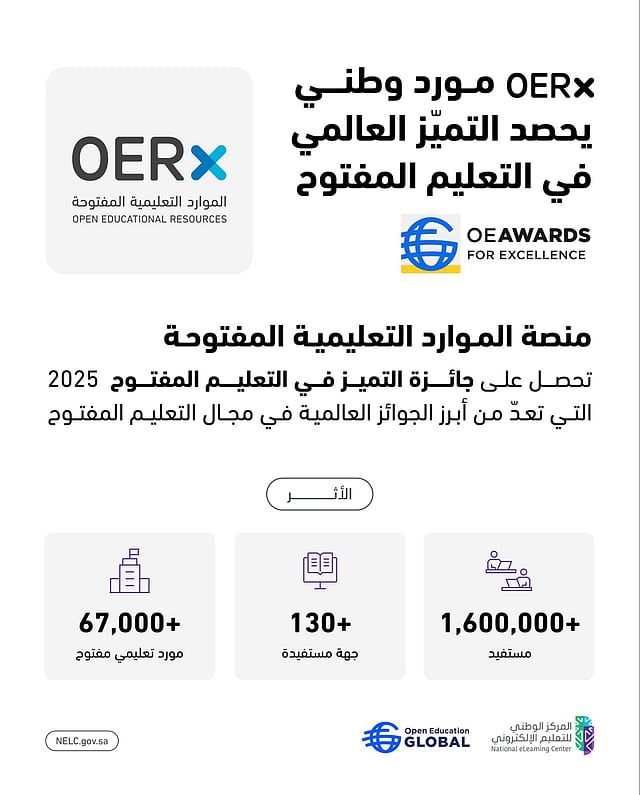 فازت المنصة الوطنية للموارد التعليمية المفتوحة (OERx) التابعة لـالمركز الوطني للتعليم الإلكتروني، بجائزة التميّز في التعليم المفتوح لعام 2025 من منظمة التعليم المفتوح العالمية (Open Education Global)، ضمن فئة الابتكار في الموارد التعليمية المفتوحة، إحدى أبرز الجوائز الدولية في نشر المعرفة وتمكين التعليم.