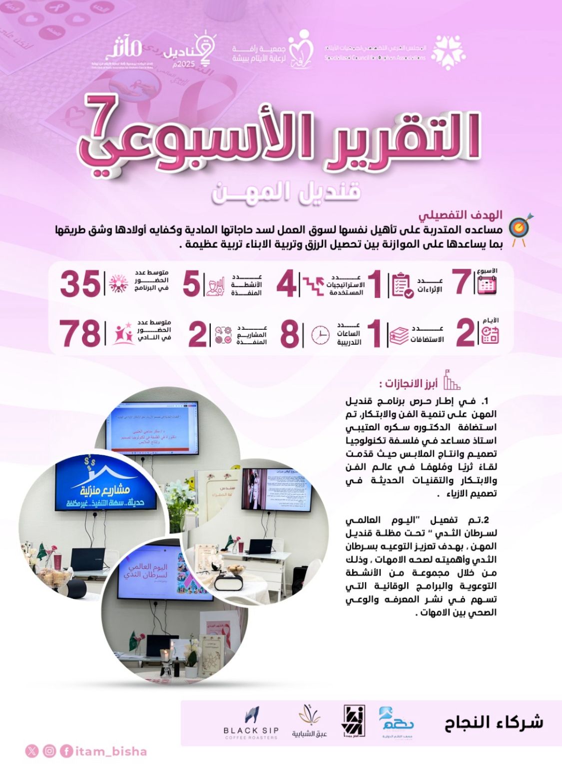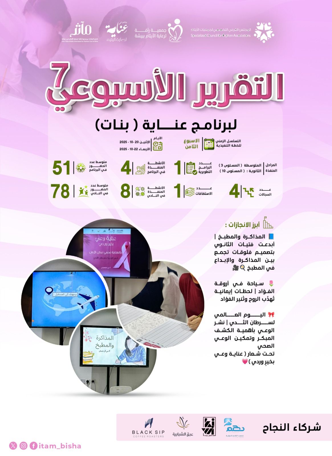 استعرضت جمعية رأفة لرعاية الأيتام بمحافظة بيشة تقريرها الأسبوعي السابع الخاص ببرنامجي عناية وقناديل بنين وبنات اليوم الجمعة 24 أكتوبر 2025.