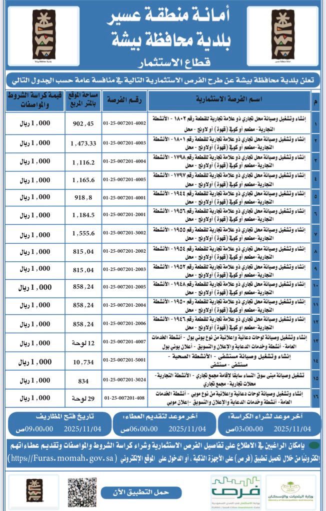 طرحت بلدية محافظة بيشة عددًا من الفرص الاستثمارية المتنوعة بلغ عددها (16) فرصة، تشمل أنشطة متعددة في المجالات البلدية والتجارية والصحية والخدمية، وذلك ضمن جهودها المتواصلة في تحفيز الاستثمار المحلي وتعزيز التنمية المستدامة بالمحافظة.
