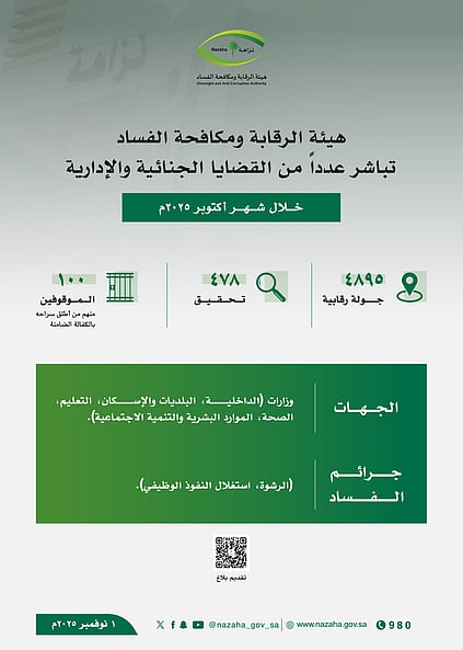 كشفت هيئة الرقابة ومكافحة الفساد (نزاهة) عن مباشرتها عدداً من القضايا الجنائية والإدارية خلال شهر أكتوبر 2025، في إطار جهودها المستمرة لحماية المال العام ومكافحة الفساد بجميع أشكاله.