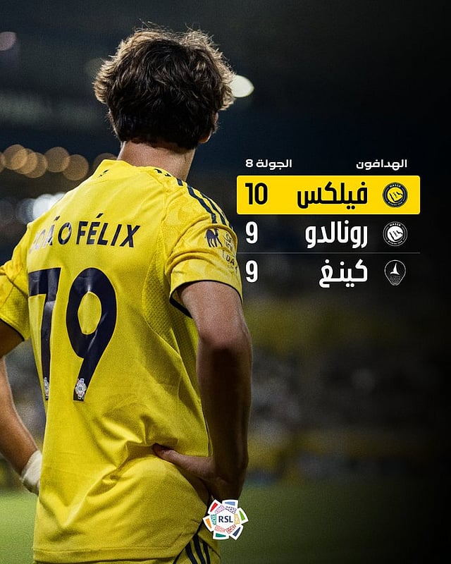 لازال لاعب النصر البرتغالي ” جواو فيليكس ” يتصدر قائمة الهدافين برصيد 10 أهداف ، وسط مطاردة من قائد فريقه ” رونالدو ” والأخير يأتي ثانياً برصيد 9 أهداف ، ولاعب الخليج جوشوا كينج ثالثاً بذات الرصيد .