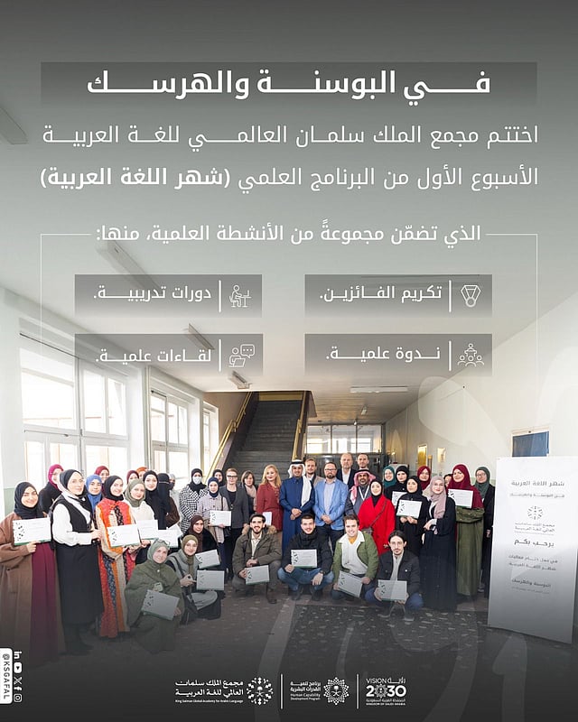 أتى ذلك عقب اختتام المجمع الأسبوع الأول من فعاليات برنامجه العلمي “شهر اللغة العربية” في العاصمة سراييفو، والذي تضمن سلسلة من اللقاءات والندوات العلمية المتخصصة وورش العمل التدريبية، مؤكدًا أن هذه الفعاليات تجسد اهتمام المملكة الكبير بتعزيز مكانة اللغة العربية وتعميق التواصل الثقافي والحضاري بين المملكة والبوسنة والهرسك.