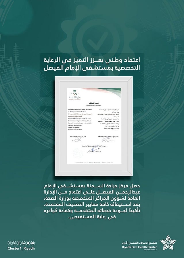 حصل مستشفى الإمام عبد الرحمن الفيصل، عضو تجمع الرياض الصحي الأول، على اعتماد مركز جراحة السمنة بعد اجتيازه متطلبات التصنيف المعتمدة من وزارة الصحة، وذلك عقب تقييم شامل أجرته لجنة مراكز التميز وفق أعلى المعايير المتعلقة بالجودة وسلامة المرضى.