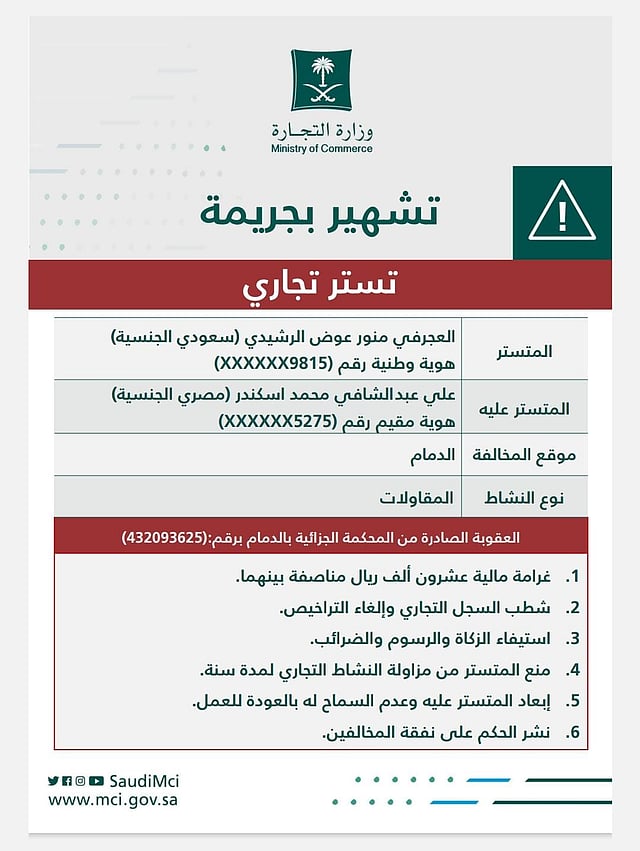 شهرت وزارة التجارة بـ “العجرفي منور عوض الرشيدي” سعودي الجنسية يحمل الهوية الوطنية المنتهية بالرقم (XXXXXX9815) و “علي عبدالشافي محمد اسكندر” مصري الجنسية يحمل هوية مقيم المنتهية بالرقم (XXXXXX5275) بعد صدور حكم قضائي يدينهما بارتكاب جريمة التستر في قطاع المقاولات بمدينة الدمام.