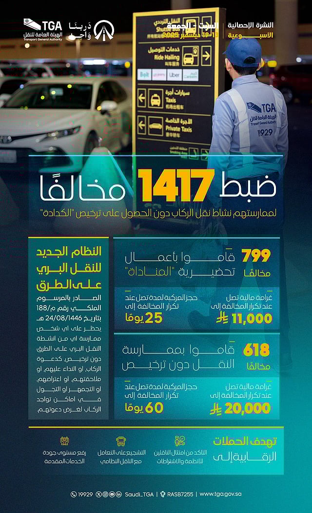 كشفت الهيئة العامة للنقل عن ضبط (1417) مخالفًا خلال الفترة من 13 إلى 19 ديسمبر 2025م، وذلك ضمن حملاتها الرقابية المكثفة على نشاط نقل الركاب دون ترخيص “الكدادة”، في مختلف مدن ومناطق المملكة.