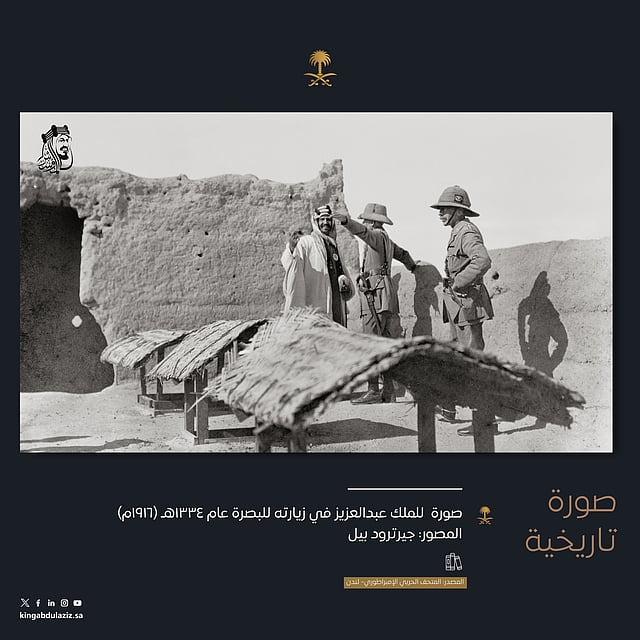أعلنت دارة الملك عبدالعزيز عن صور أرشيفية توثّق جولة الملك عبدالعزيز بن عبدالرحمن آل سعود – رحمه الله – في ضواحي مدينة البصرة عام 1334هـ (1916م)، وذلك في مرحلة مبكرة من مساعيه لتوطيد العلاقات الإقليمية، وتوسيع دائرة التواصل مع محيطه العربي والدولي.