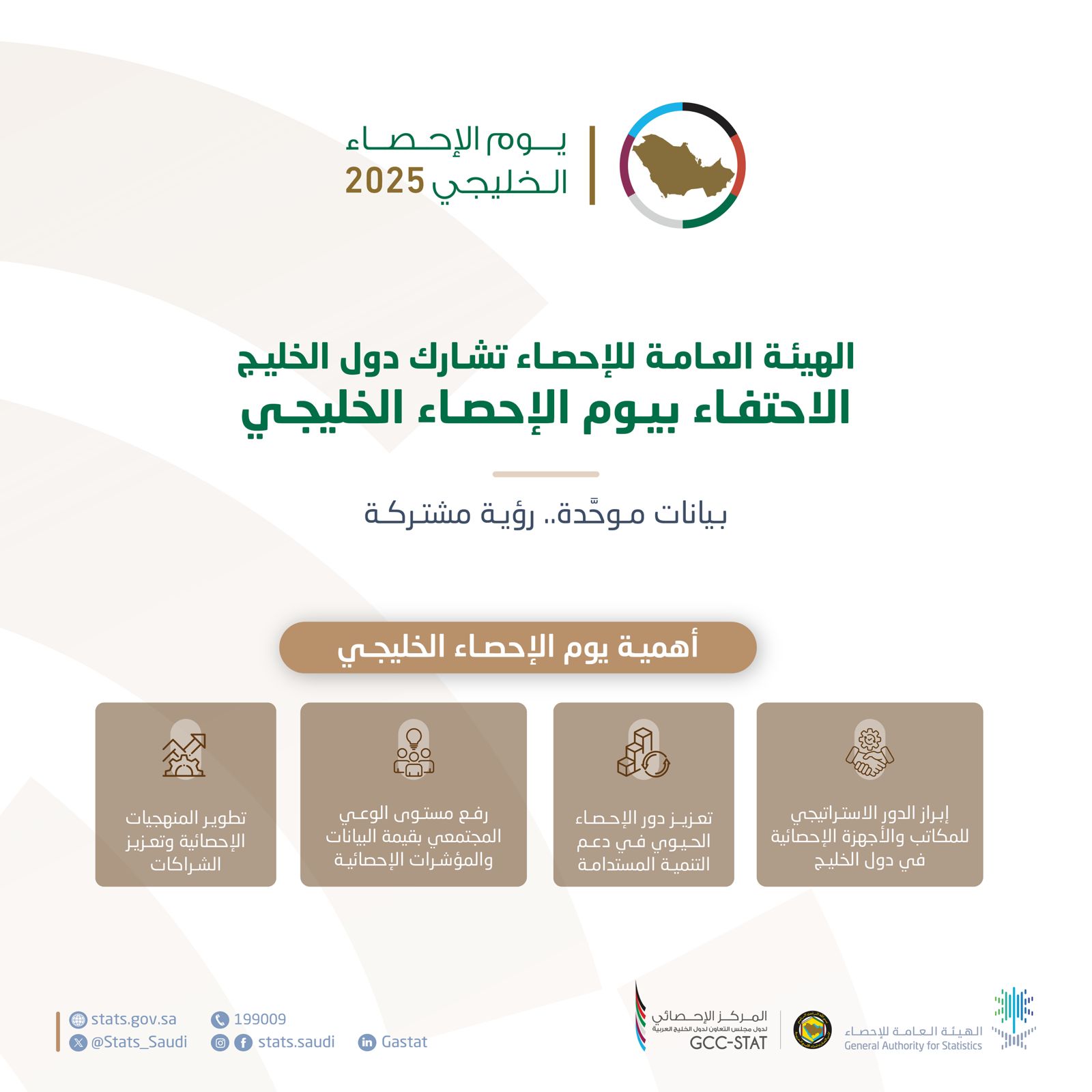 وجاء الاحتفاء هذا العام استمرارًا لجهود دول المجلس في بناء منظومات بيانات إحصائية متقدمة تُسهم في توفير إحصاءات دقيقة وموحّدة، تعزّز فاعلية السياسات العامة وتدعم صناعة القرار، لمواكبة مستهدفات التنمية المستدامة. ويُعد يوم الإحصاء الخليجي مناسبة سنوية لإبراز أهمية القطاع الإحصائي ودوره المحوري في رسم ملامح المستقبل التنموي لدول المجلس، إلى جانب تعزيز وعي المجتمع بقيمة البيانات الإحصائية بوصفها عنصرًا رئيسًا في التطوير والنمو والتقدّم.