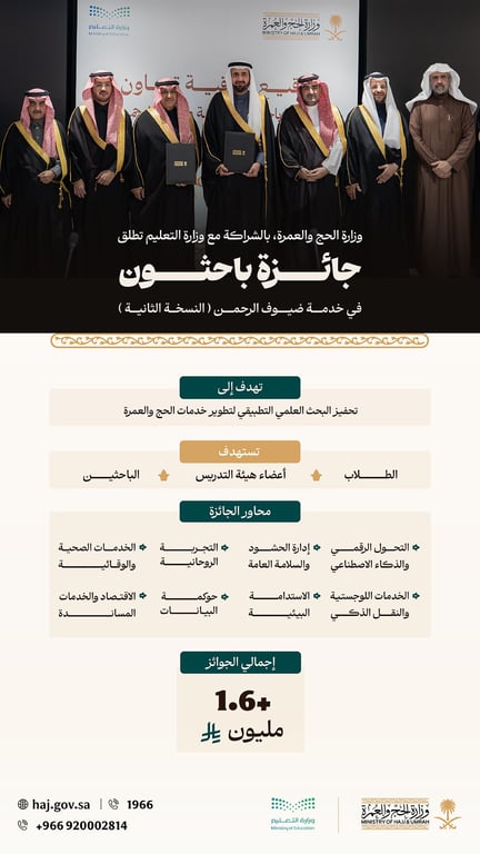 أطلقت وزارة الحج والعمرة، بالشراكة مع وزارة التعليم، النسخة الثانية من جائزة «باحثون في خدمة ضيوف الرحمن»، في إطار جهود توظيف المعرفة والبحث العلمي التطبيقي للارتقاء بخدمات الحج والعمرة وتحسين جودة التجربة المقدمة للحجاج والمعتمرين.
