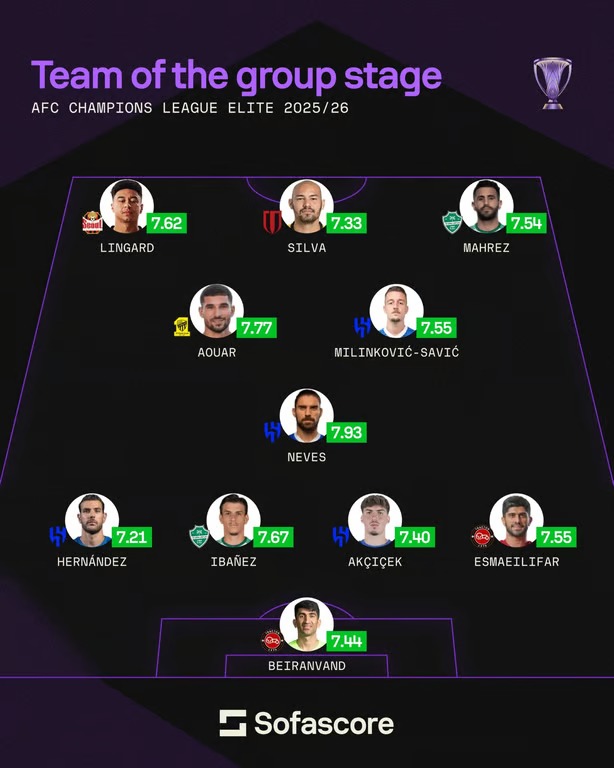 كشفت شبكة «سوفا سكور» التشكيلة المثالية لمرحلة دور المجموعات من منافسات دوري أبطال آسيا للنخبة لموسم 2025–2026، وشهدت القائمة حضورًا بارزًا للاعبي الدوري السعودي.