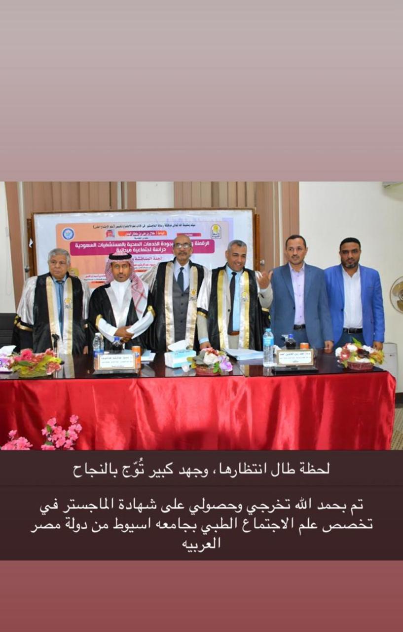 حصل الأستاذ طلال علي الشهراني على درجة الماجستير في تخصص علم الاجتماع الطبي من جامعة أسيوط بجمهورية مصر العربية، بعد مناقشة علمية متميزة تُوِّجت بالإشادة بجهوده البحثية ومخرجاته العلمية.